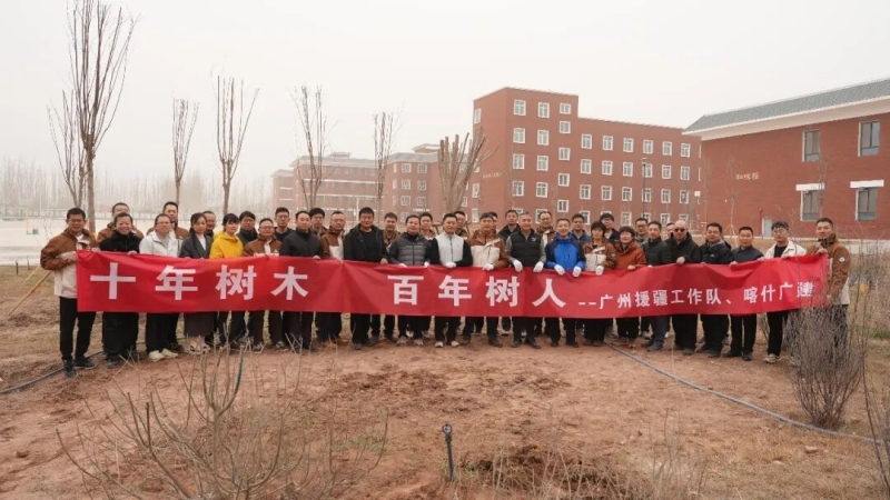 近日,广州援疆工作队联合喀什广建集团有限公司,在广州新城实验中学开展“十年树木 百年树人”植树活动。援疆干部以实际行动栽下“援疆林”,既为校园添绿,也寄托对边疆教育振兴的美好期许,成为同心帮扶、共育人才的生动写照。植树现场,大家三五成组、分工协作,挥锹铲土、扶苗培土、提桶浇水,每一锹土都压实,每一桶水都浇透,确保树苗扎根稳固、成活率高。